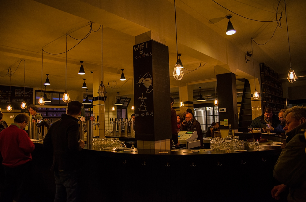 Unutrašnjost je sasvim jednostavna. Kružni izduženi šank sa hrpama točionika, bijele pločice, pivske boce naslagane po zidovima. Ove godine je preuređena, prije toga je bila otprilike upola manja. Nekoliko konobara užurbano toči pive. Ovo je isto zapravo “kušaonica”. Vjerojatno je to razlog zašto ne radi baš dugo u noć, zatvara se već u 8 navečer! To ne znači da je ritam tamo spor, subotom predvečer je tamo totalna ludnica. Ljudi ko u priči. Žamor, razgovor, buka. Skupljači čaša nose metar, metar i pol visoke stupce čaša sa stolova… Vani hladno i puše vjetar, sve vanjske klupe su pune… obožavam to mjesto. 😀