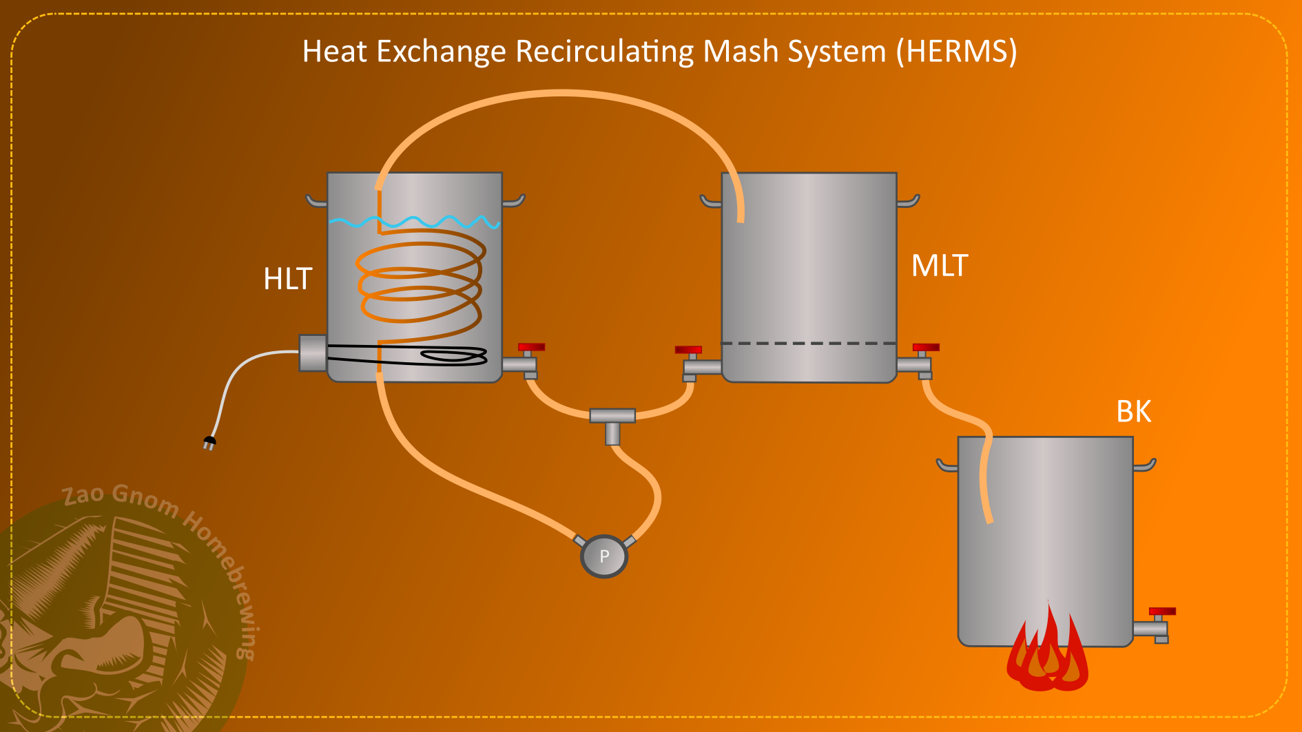 HERMS, skraćeno od Heat Exchange Recirculating Mash System je jedan od tipova sustava koji služi za kuhanje piva. Zapravo više za odrađivanje ukomljavanja. Kad smo već kod kratica, pogledajmo sliku, da definiramo neke pojmove. HLT znači Hot Liquor Tank, odnosno spremnik sa vrućom vodom. MLT je Mash Lauter Tun, odnosno posuda za ukomljavanje. BK je Boil Kettle, odnosno kotao za kuhanje. Dio na slici označen sa “P” je pumpa.